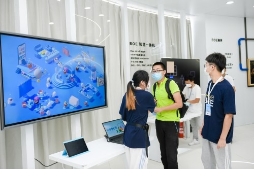 来到智能家居体验区,参观者只需“躺”在床上,触发枕头上的压力感应装置,便可通过49英寸ADS无界拼接大屏,让你的卧室幻化出星空云海、宇宙银河、热带雨林等场景,让参观者仿若置身于梦境之中。在智慧健康体验区,通过参与传感搏击游戏,参观者可实时在超高清大屏上获取速度、力度等健康数据,同时投影互动墙还全面展示了BOE(京东方)基于个人健康管理、社区卫生服务和数字医院诊疗的全方位全周期健康管理平台。在智慧交通体验区,采用透明OLED显示的“智能炫窗”集显示与调光于一体,让人们在旅途中可随时进行观影娱乐、调光遮阳等功能的切换。最近,智能炫窗系列产品还应用在了我国首创的全球最高时速600公里磁悬浮列车上。在智慧办公体验区,BOE(京东方)全新推出的5376超高分区Mini LED背光智慧一体机分外亮眼,通过融合十大AI创新科技,无缝切换办公、会议、绘画三大场景,为人们带来智慧高效的全新办公体验。在智慧文博体验区,采用类纸护眼显示技术的BOE画屏,让电子屏幕像纸张一样呈现世界名画的细腻笔触与真实质感,并且兼具绿色健康的视觉体验,搭配后台智能互动程序,让艺术品重新“活”了起来,带来一场穿越时空的奇妙邂逅。展馆出口处还采用LED全景式屏幕搭建了裸眼3D沉浸式空间,参观者可以在这里写下寄语和祝福,留下专属的美好记忆。